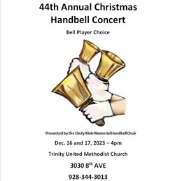 The Cindy Klein Memorial Handbell Choir presents their 44th Annual Handbell Christmas Concert, "Children's Favorites" The Concert will be held at Trinity United Methodist Church 3030 8th Ave in Yuma on Saturday and Sunday, December 14th and 15th starting at 4pm. For more information regarding The Cindy Klein Memorial Handbell Choir or the Christmas Concert, call 928-344-3013.