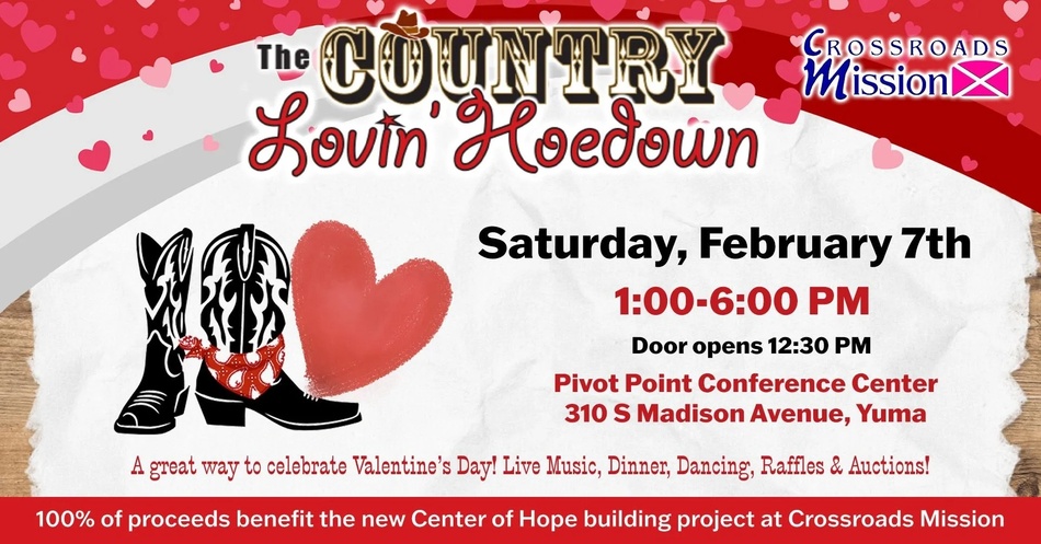 Crossroads Mission is excited to announce our The Annual Country-Lovin' Hoedown is back this Saturday February 7th, 2026. Come enjoy live music, dancing, raffles, auctions, dinner, and more! Get ready for a night worthy of the wild west, all to bring in the amazing new year! Have fun for a good cause, 100% of the proceeds made from this event will benefit the new Center of Hope Building project at Crossroads Mission.