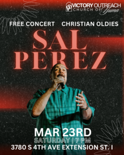 Victory Outreach Church of Yuma invites the Yuma community to attend a Free Christian Oldies Concert featuring Sal Perez Saturday March 23rd7pm3780 S. 4th Avenue Extension Suite 1