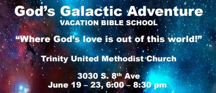 Trinity United Methodist Church invites children preschool thru grade school who are looking for out-of-this-world fun this summer to join them for their God's Galactic Adventure VBS.