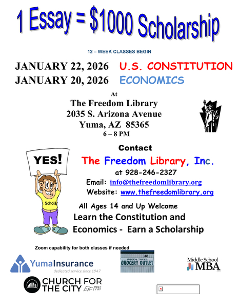 Register for The Freedom Library scholarship classes and give yourself an opportunity to earn a $1,000 scholarship! You'll have a great learning experience even if you're not interested in one of the scholarships. Anyone age 14 and older is eligible. REGISTER NOW at www.thefreedomlibrary.org