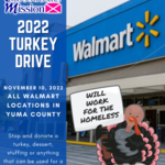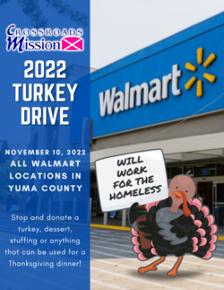 Thursday November 10th stop by any of the Yuma area Walmart's to drop off your donations to help support the Crossroads Mission Thanksgiving dinner and local families & veterans in need.