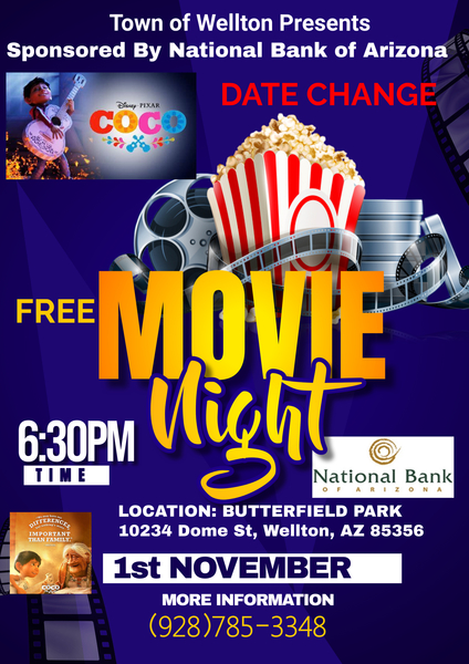 The town of Wellton is inviting the community to join them for a FREE Movie Night!The will be showing CocoNovember 1st6:30pmButterfield Park10234 Dome StreetWellton AZ