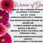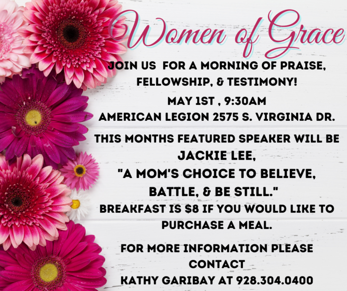 Women of Grace invite ladies from the Yuma community to gather together for a time of praise, fellowship, & testimony.